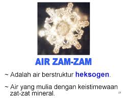 Seperkara lagi tentang air ini, tahukah anda dalam banyak-banyak air, ada satu jenis air yang cukup istimewa dihasilkan khas oleh Allah SWT. Pasti ada yang sudah tahu air yang saya maksudkan. Ya, air zamzam.